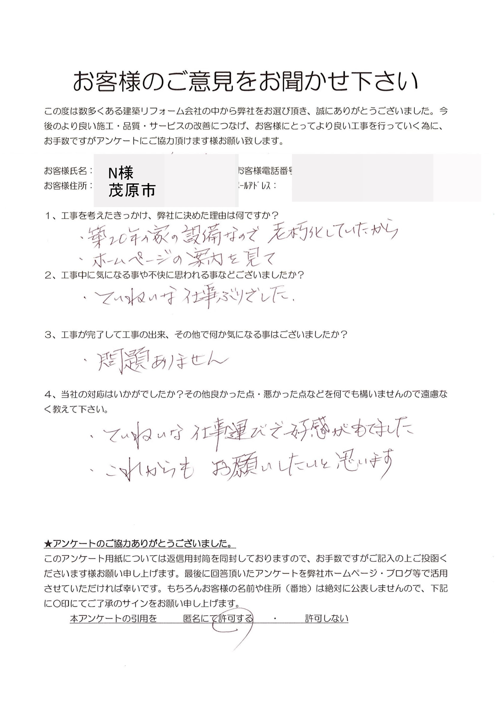 茂原市 N様 トイレ・キッチン修繕工事 1.工事のきっかけ、弊社に決めた理由はなんですか? 築20年の家の設備なので老朽化していたから。 ホームページの案内を見て決めました。 2.工事中に気になることや不快に思われることはございましたか? 丁寧な仕事ぶりでした。 3.工事が完了して工事の出来、その他で何か気になることはございましたでしょうか? 問題ありません。 4.当社の対応はいかがでしたか?その他良かった点・悪かった点など遠慮なく教えてください。 丁寧な仕事運びで好感がもてました。 これからもお願いしたいと思います。 前の記事 次の記事 一覧へ戻る