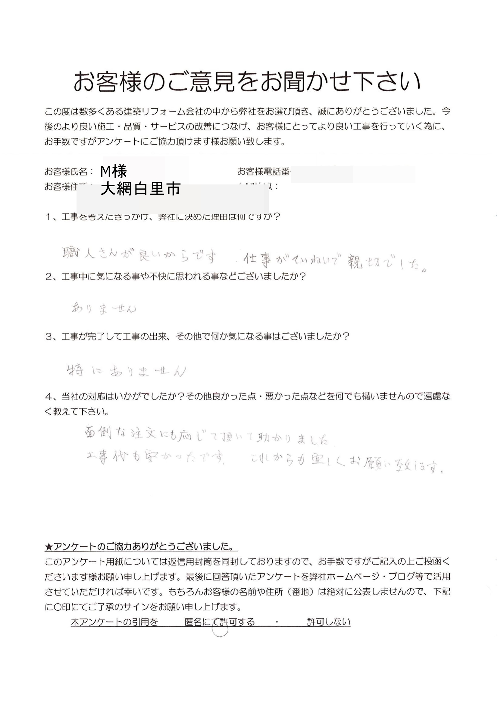 大網白里市 M様 外壁塗装改修工事他 1.工事のきっかけ、弊社に決めた理由はなんですか? 職人さんが良いからです。 仕事が丁寧で親切でした。 2.工事中に気になることや不快に思われることはございましたか? ありません。 3.工事が完了して工事の出来、その他で何か気になることはございましたでしょうか? 特にありません。 4.当社の対応はいかがでしたか?その他良かった点・悪かった点など遠慮なく教えてください。 面倒な注文にも応じて頂いて助かりました。 工事代も安かったです。 これからもよろしくお願い致します。 前の記事 次の記事 一覧へ戻る