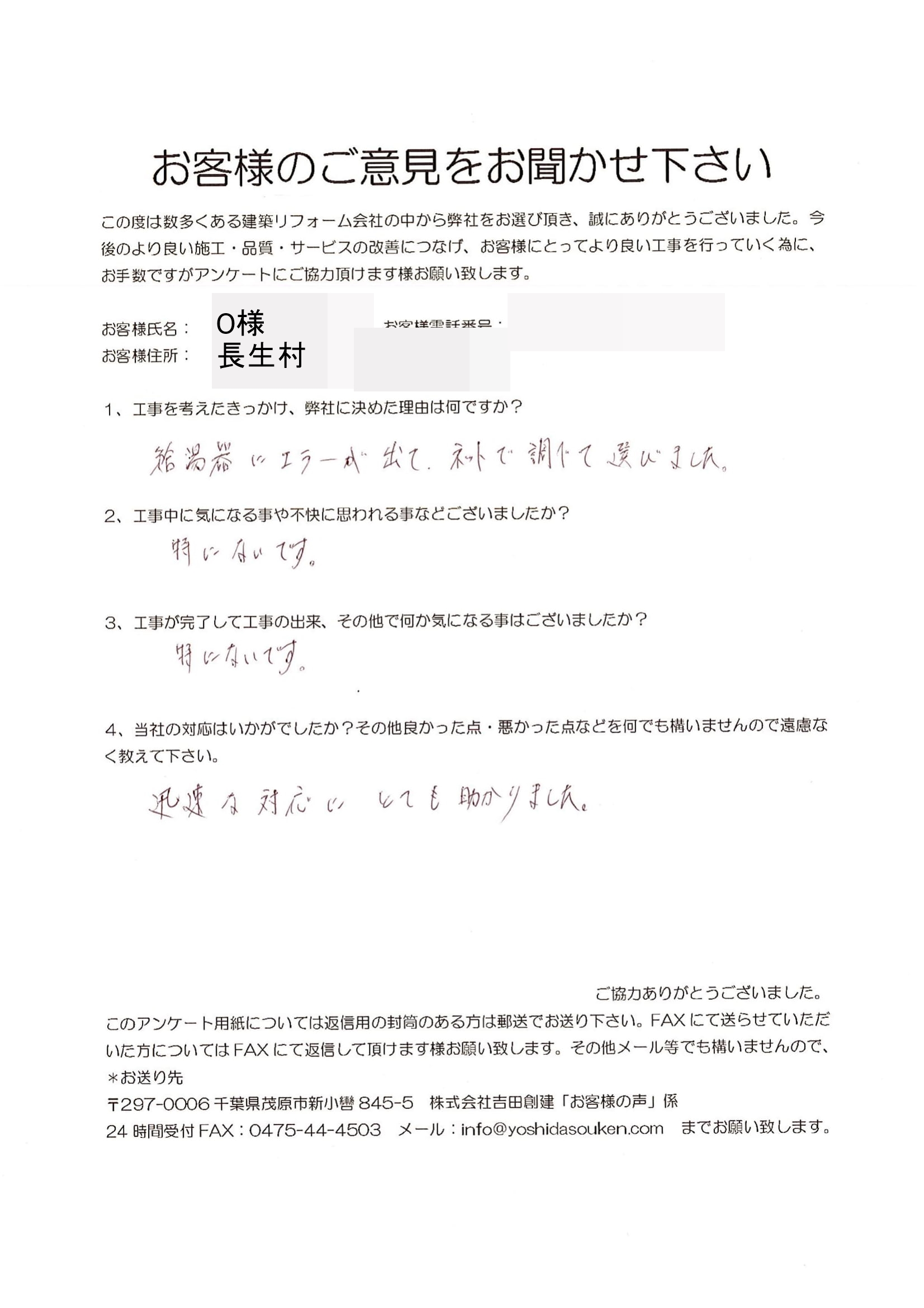 長生村 O様 給湯器交換工事 1.工事のきっかけ、弊社に決めた理由はなんですか? 給湯器にエラーが出てネットで調べて選びました。 2.工事中に気になることや不快に思われることはございましたか? 特にありません。 3.工事が完了して工事の出来、その他で何か気になることはございましたでしょうか? 特にありません。 4.当社の対応はいかがでしたか?その他良かった点・悪かった点など遠慮なく教えてください。 迅速な対応にとても助かりました。 前の記事 次の記事 一覧へ戻る