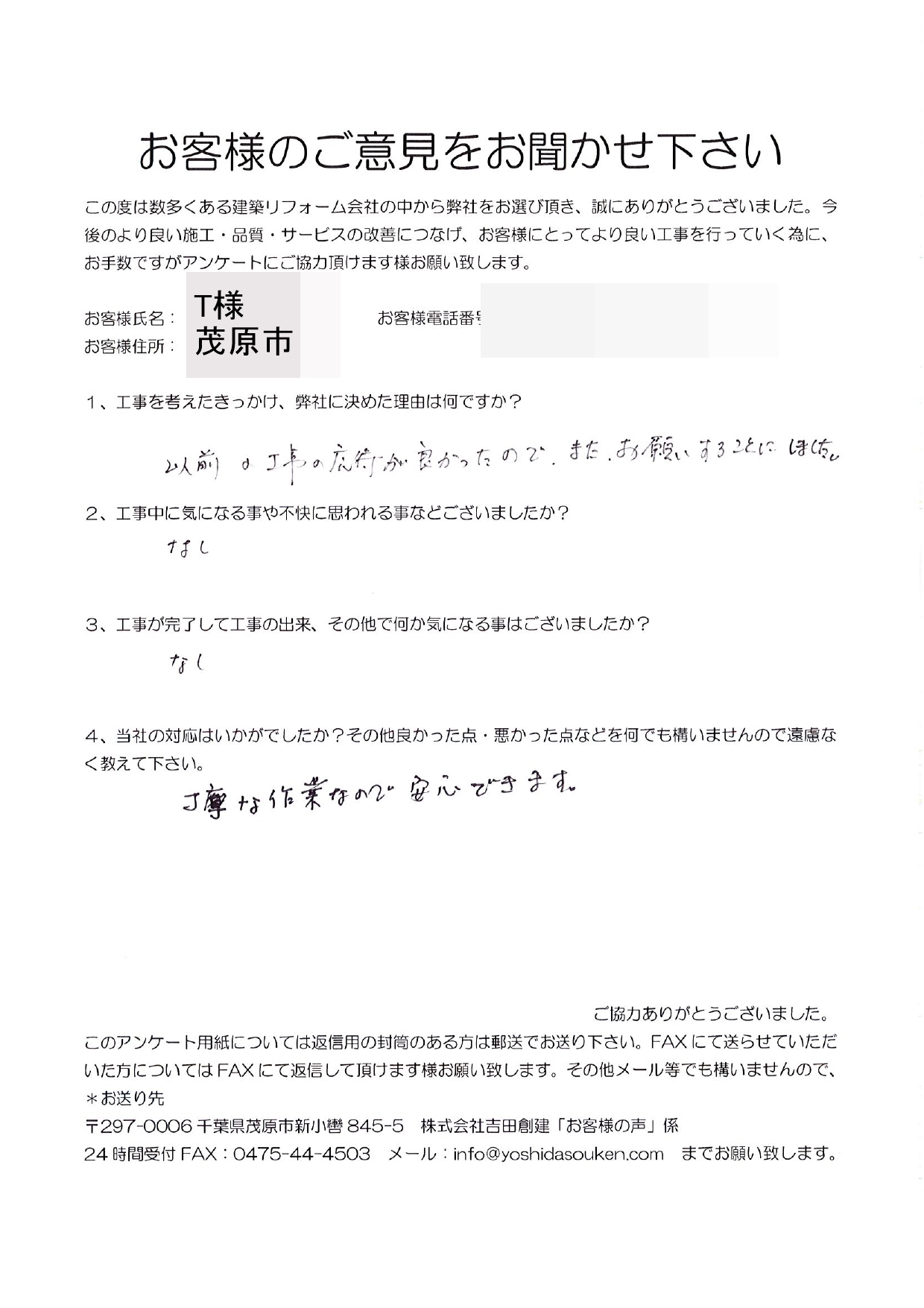茂原市 T様 建具修繕工事 1.工事のきっかけ、弊社に決めた理由はなんですか? 以前の工事の対応が良かったので、またお願いすることにしました。 2.工事中に気になることや不快に思われることはございましたか? 特にありません。 3.工事が完了して工事の出来、その他で何か気になることはございましたでしょうか? 特にありません。 4.当社の対応はいかがでしたか?その他良かった点・悪かった点など何でも構いませんので遠慮なく教えてください。 丁寧な作業なので安心できます。 前の記事 次の記事 一覧へ戻る