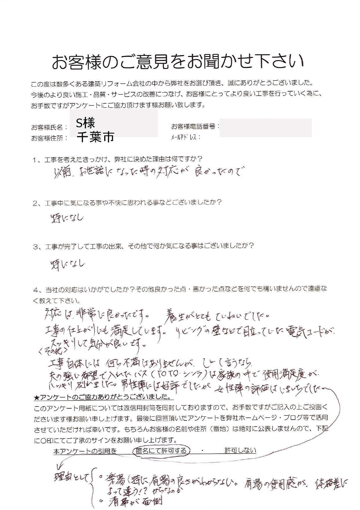 3.工事が完了して工事の出来、その他で何か気になることはございましたでしょうか?