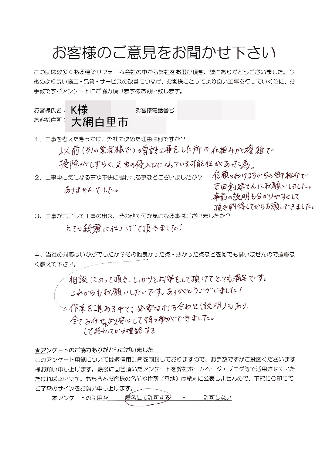 信頼のおける方からの御紹介で吉田創建さんにお願いしました。
