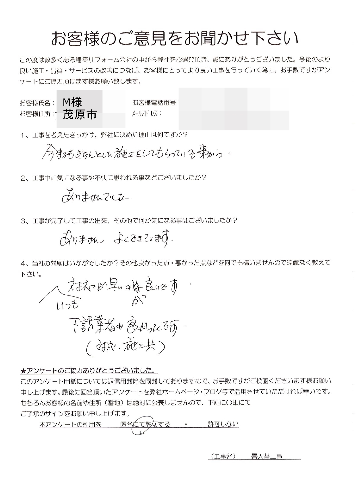茂原市 M様 畳入替工事 1.工事のきっかけ、弊社に決めた理由はなんですか? 今までもきちんと施工してもらっている事から 2.工事中に気になることや不快に思われることはございましたか? ありませんでした。 3.工事が完了して工事の出来、その他で何か気になることはございましたでしょうか? ありません。よくできています。 4.当社の対応はいかがでしたか?その他良かった点・悪かった点など遠慮なく教えてください。 いつも対応が早いのが良いです。 下請け業者も良かったです。(対応、施工共) 前の記事 次の記事 一覧へ戻る
