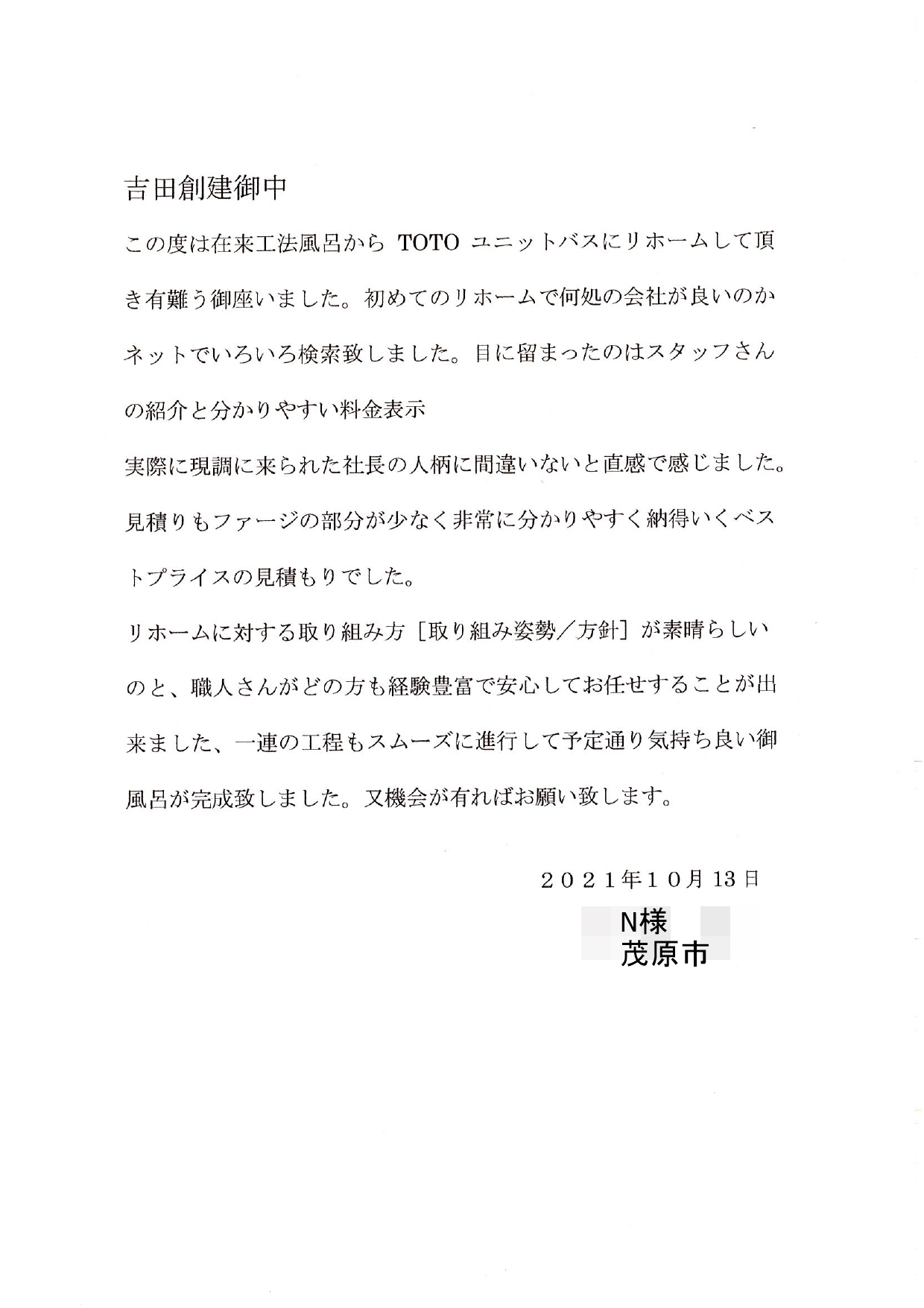 この度は在来工法風呂からTOTOユニットバスにリフォームして頂き有難う御座いました。初めてのリフォームで何処の会社が良いのかネットで色々検索致しました。目に留まったのはスタッフさんの紹介と分かりやすい料金表示