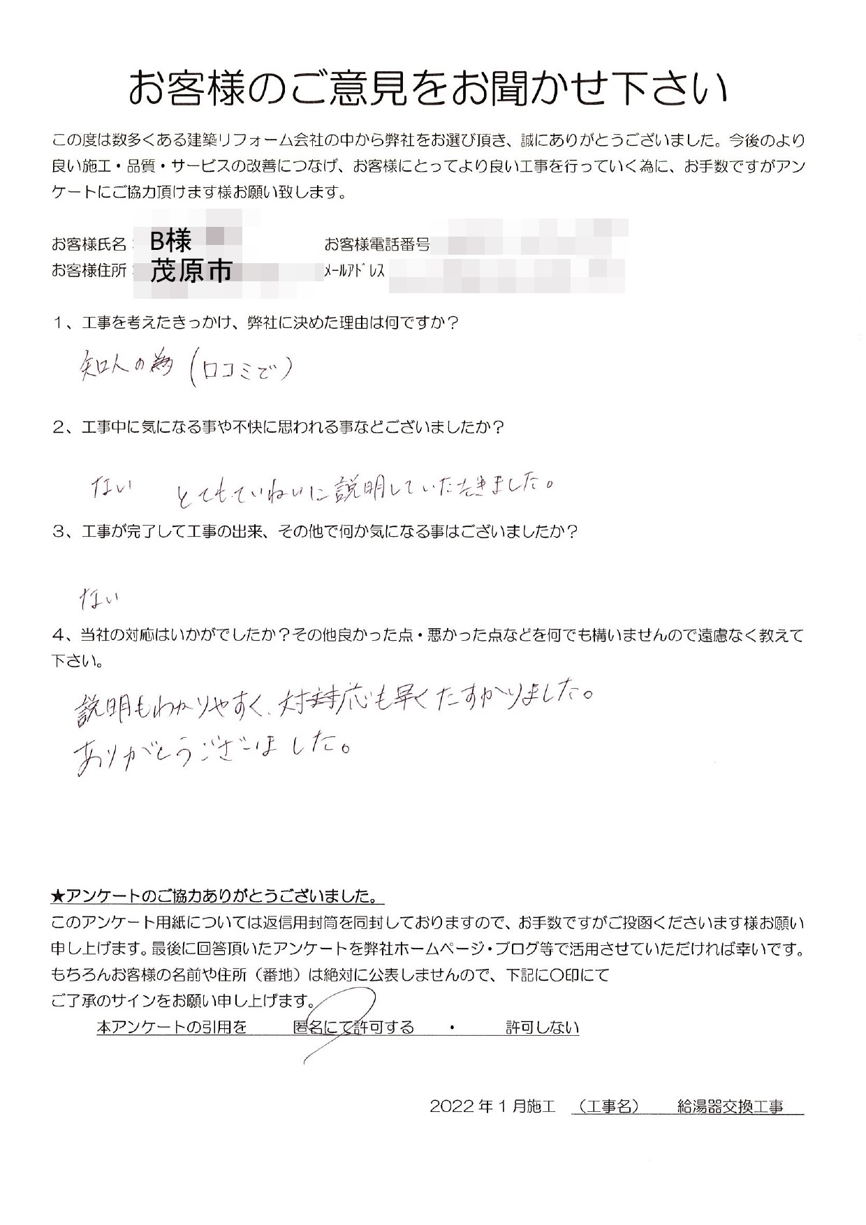 茂原市 B様邸 給湯器交換工事 1.工事のきっかけ、弊社に決めた理由はなんですか? 知人の為(口コミで) 2.工事中に気になることや不快に思われることはございましたか? とてもていねいに説明していただきました。 3.工事が完了して工事の出来、その他で何か気になることはございましたでしょうか? 特にありません。 4.当社の対応はいかがでしたか?その他良かった点・悪かった点など遠慮なく教えてください。 説明もわかりやすく、対応も早く助かりました。 ありがとうございました。 前の記事 次の記事 一覧へ戻る