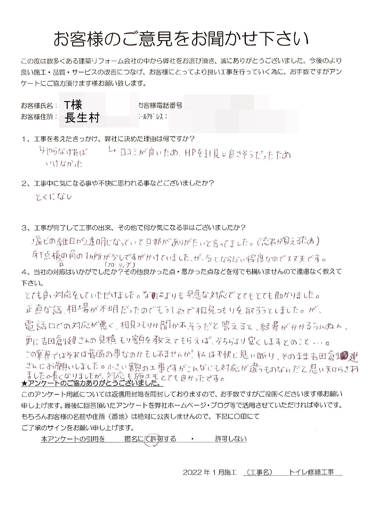 3.工事が完了して工事の出来、その他で何か気になることはございましたでしょうか?