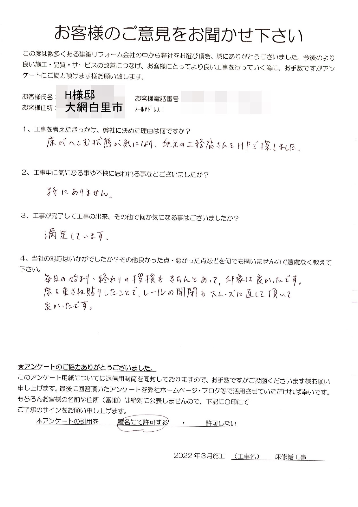 大網白里市 H様 床修繕工事 1.工事のきっかけ、弊社に決めた理由はなんですか? 床がへこむ状態が気になり地元の工務店さんをHPで探しました。 2.工事中に気になることや不快に思われることはございましたか? 特にありません。 3.工事が完了して工事の出来、その他で何か気になることはございましたでしょうか? 満足しています。 4.当社の対応はいかがでしたか?その他良かった点・悪かった点など遠慮なく教えてください。 毎日の始まり、終わりの挨拶もきちんとあって、印象は良かったです。 床を重ねた貼りしたことで、レールの開閉もスムーズに直して頂いて良かったです。 前の記事 次の記事 一覧へ戻る