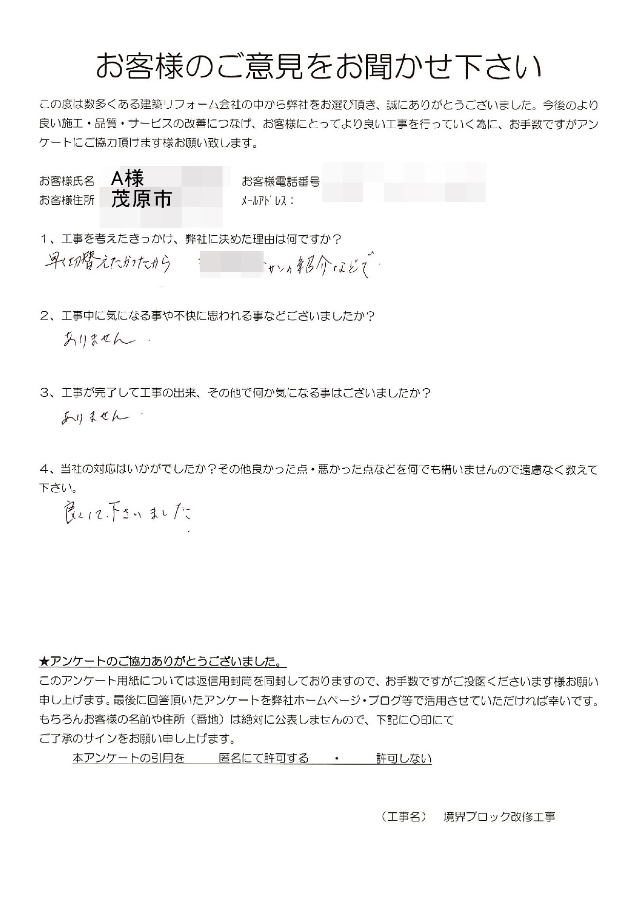 茂原市 A様 境界ブロック改修工事 1.工事のきっかけ、弊社に決めた理由はなんですか? 早く切り替えたかったから 紹介などで 2.工事中に気になることや不快に思われることはございましたか? ありません。 3.工事が完了して工事の出来、その他で何か気になることはございましたでしょうか? ありません。 4.当社の対応はいかがでしたか?その他良かった点・悪かった点など遠慮なく教えてください。 良くしてくださいました。 前の記事 次の記事 一覧へ戻る