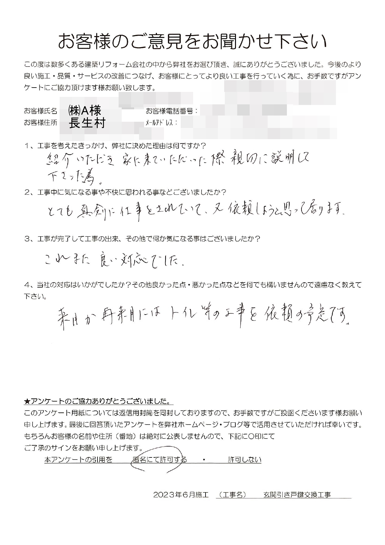 長生村 ㈱A様 玄関引き戸鍵交換工事 1.工事のきっかけ、弊社に決めた理由はなんですか? 紹介いただき家に来て頂いた際、親切に説明して下さった為。 2.工事中に気になることや不快に思われることはございましたか? とても真剣に仕事をされていて又依頼しようと思って居ります。 3.工事が完了して工事の出来、その他で何か気になることはございましたでしょうか? これまた良い対応でした。 4.当社の対応はいかがでしたか?その他良かった点・悪かった点など遠慮なく教えてください。 来月か再来月にはトイレ等の工事を依頼の予定です。 前の記事 次の記事 一覧へ戻る