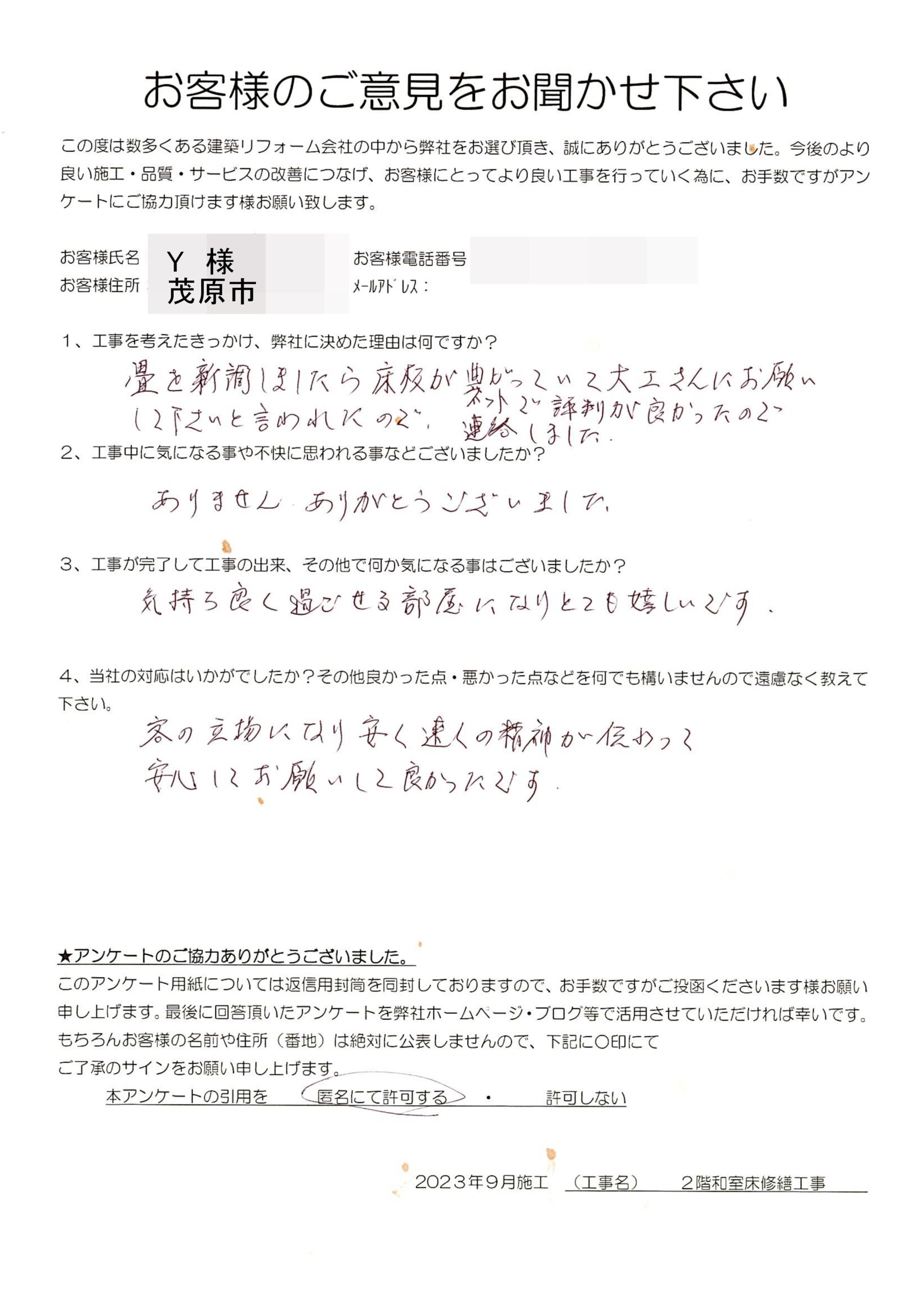 茂原市 Y様 2階和室床修繕工事 1.工事のきっかけ、弊社に決めた理由はなんですか? 畳を新調しましたら床板が曲がっていて大工さんにお願いして下さいと言われたので、ネットで評判が良かったので連絡しました。 2.工事中に気になることや不快に思われることはございましたか? ありません。ありがとうございました。 3.工事が完了して工事の出来、その他で何か気になることはございましたでしょうか? 気持ち良く過ごせる部屋になりとても嬉しいです。 4.当社の対応はいかがでしたか?その他良かった点・悪かった点など遠慮なく教えてください。 客の立場になり安く速くの精神が伝わって安心してお願いして良かったです。 前の記事 次の記事 一覧へ戻る