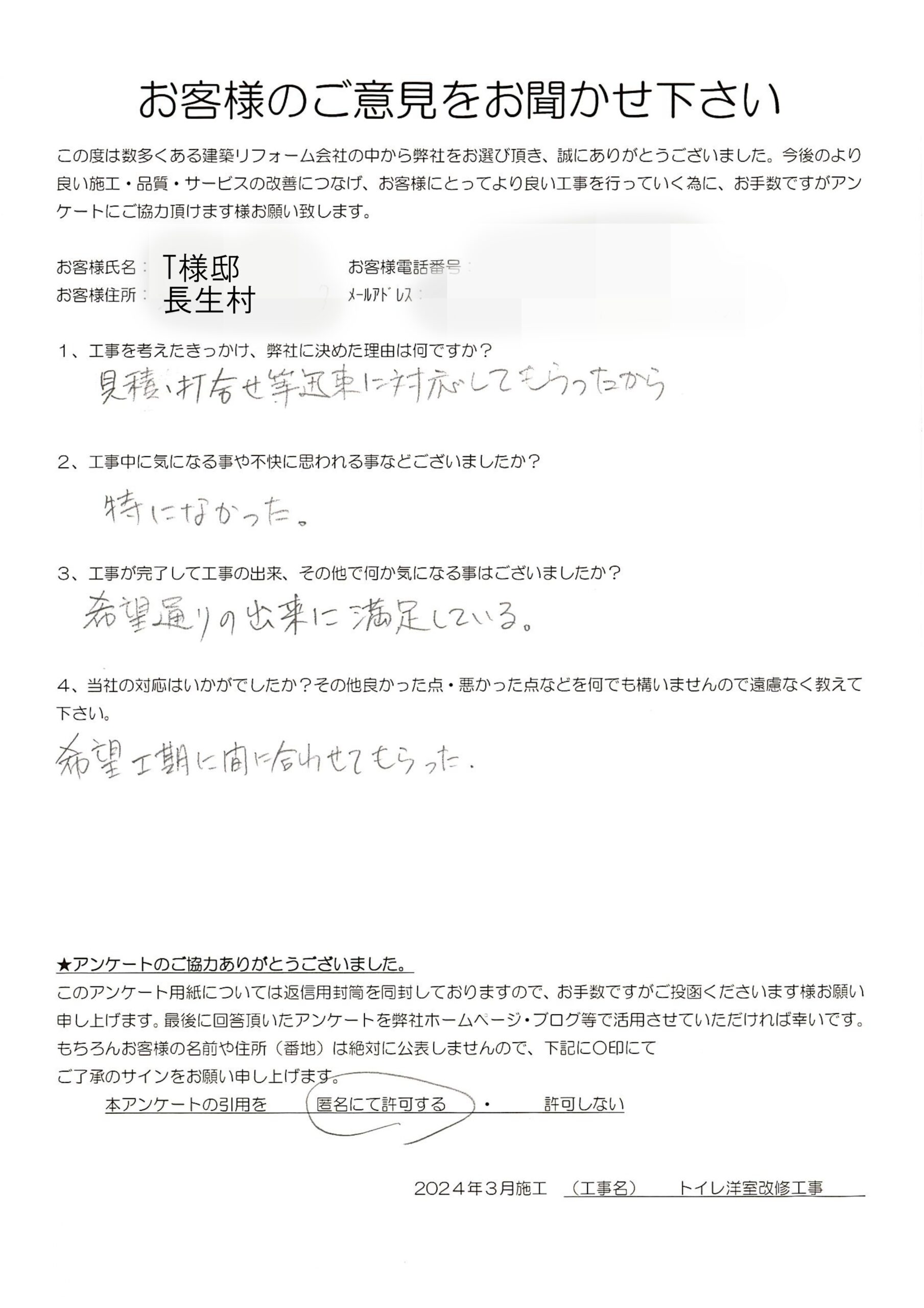 長生村 T様 トイレ洋室改修工事 1.工事のきっかけ、弊社に決めた理由はなんですか? 見積、打合せ等迅速に対応してもらったから 2.工事中に気になることや不快に思われることはございましたか? 特にありません。 3.工事が完了して工事の出来、その他で何か気になることはございましたでしょうか? 希望通りの出来に満足している。 4.当社の対応はいかがでしたか?その他良かった点・悪かった点など遠慮なく教えてください。 希望工期に間に合わせてもらった。 前の記事 次の記事 一覧へ戻る