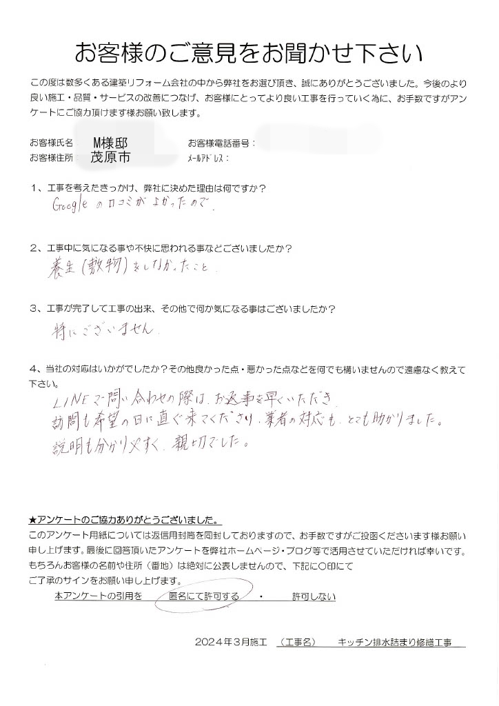 茂原市 M様 キッチン排水詰まり修繕工事 1.工事のきっかけ、弊社に決めた理由はなんですか? Googleの口コミが良かったので 2.工事中に気になることや不快に思われることはございましたか? 養生(敷物)をしなかったこと 3.工事が完了して工事の出来、その他で何か気になることはございましたでしょうか? 特にございません。 4.当社の対応はいかがでしたか?その他良かった点・悪かった点など遠慮なく教えてください。 LINEで問い合わせの際は、お返事を早くいただき訪問も希望の日に直ぐ来て下さり、業者の対応もとても助かりました。 説明も分かりやすく親切でした。 前の記事 次の記事 一覧へ戻る