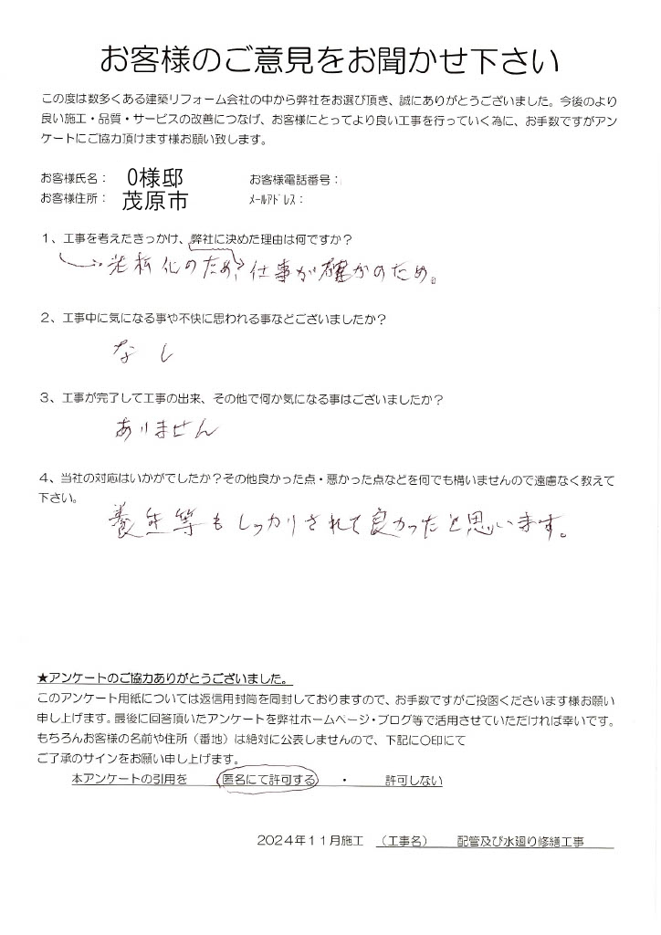 茂原市 O様 配管及び水廻り修繕工事 1.工事のきっかけ、弊社に決めた理由はなんですか? ・老朽化のため ・仕事が確かの為 2.工事中に気になることや不快に思われることはございましたか? ありません。 3.工事が完了して工事の出来、その他で何か気になることはございましたでしょうか? ありません。 4.当社の対応はいかがでしたか?その他良かった点・悪かった点など遠慮なく教えてください。 養生等もしっかりされて良かったと思います。 前の記事 次の記事 一覧へ戻る